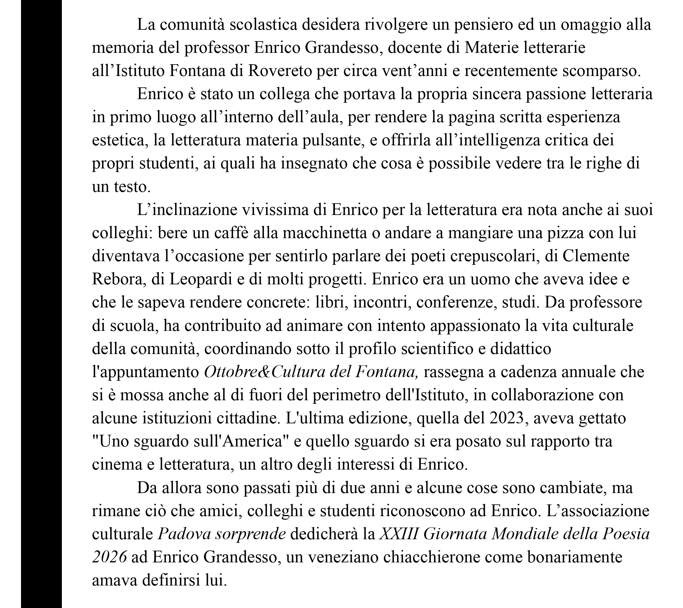 La comunità scolastica desidera rivolgere un pensiero ed un omaggio alla memoria del professor Enrico Grandesso.