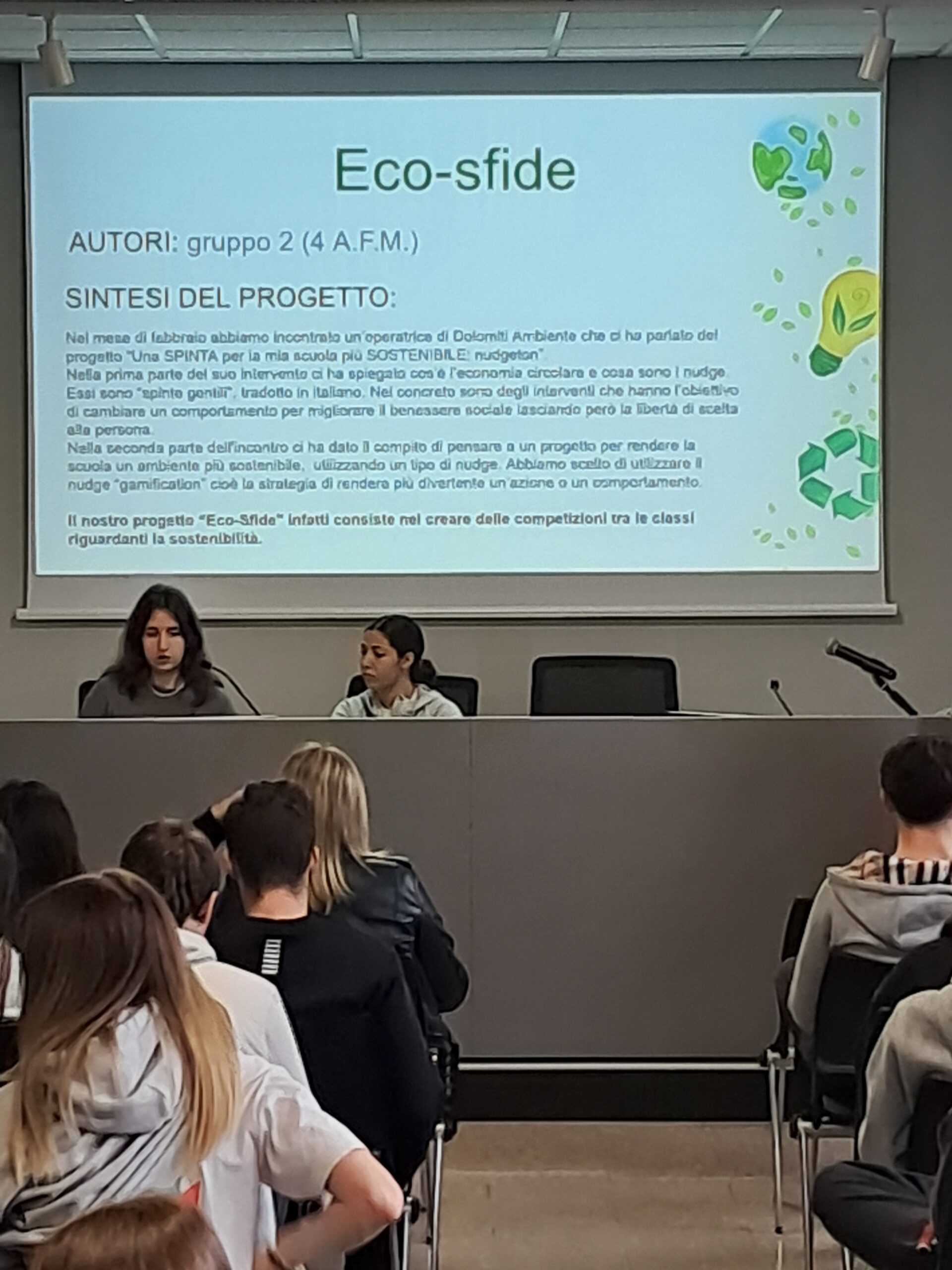 Le varie proposte sono state esposte a diversi stakeholders (sia interni che esterni alla scuola), alla presenza del CEO di Dolomiti Ambiente e di alcuni rappresentanti della politica locale, nella speranza di riuscire a “spingere” gentilmente a piccoli/grandi miglioramenti dell’ambiente scuola.